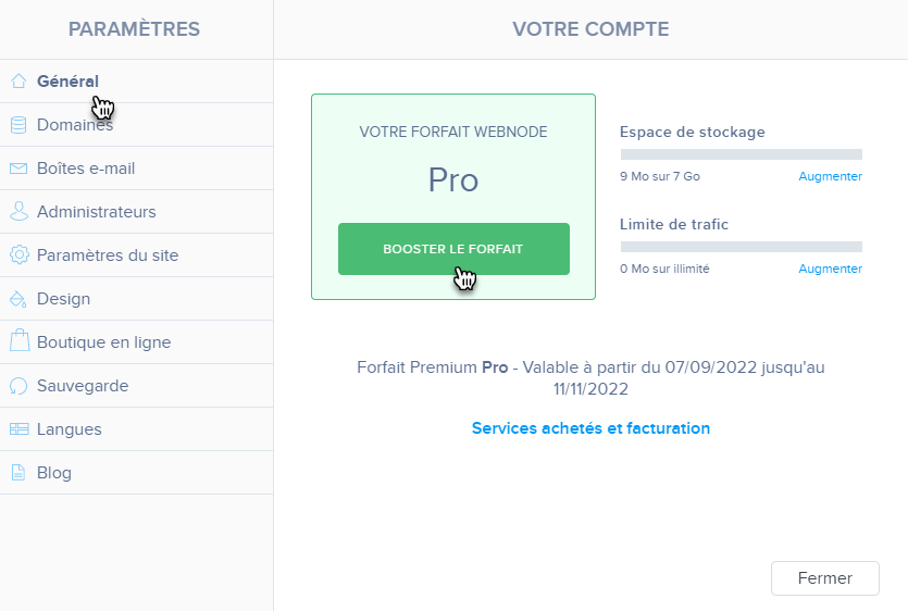 3. Dans l'onglet Général, cliquez sur Booster le forfait.