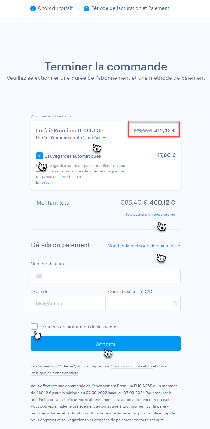 5.  Choisissez la   période  et le mode de paiement, ou ajoutez un service supplémentaire  (sauvegarde automatique). Si vous disposez d'un bon de réduction, cochez la case “Je dispose d’un code promo”. Si vous souhaitez renseigner les informations de facturation, sélectionnez “Données de facturation de la société”.