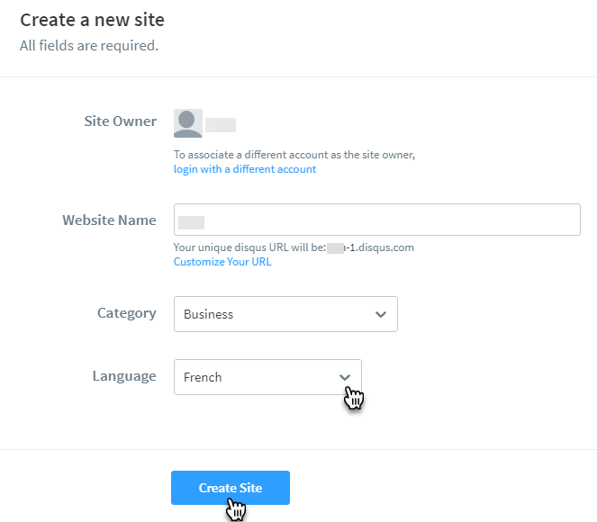 4. Saisissez un nom de domaine, sélectionnez un thème de page et de langue, puis confirmez en cliquant sur le bouton Create Site (traduction: Créer un site).