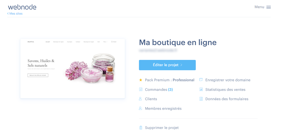 Vous avez la possibilité d´enregistrer un nom de domaine (une nouvelle adresse sans "webnode") pour chaque boutique en ligne. L´adresse de votre boutique en ligne peut donc être www.maboutiqueenligne.fr. Vous trouverez un mode d'emploi pour enregistrer votre nom de domaine dans l´article Acheter un nom de domaine.