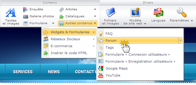Cliquez sur le bouton "Autres contenus" dans la barre d'outils et ensuite sur "Widgets et formulaires". Choisissez l'option "Forum".