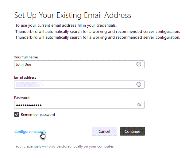 4. Saisissez votre nom (que les destinataires verront lorsque vous leur enverrez des e-mails), votre adresse e-mail (créée dans Webnode) et votre mot de passe. Cliquez ensuite sur Configurer manuellement.