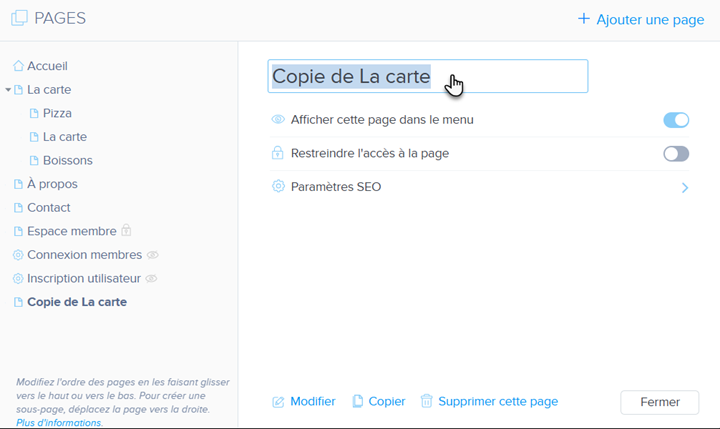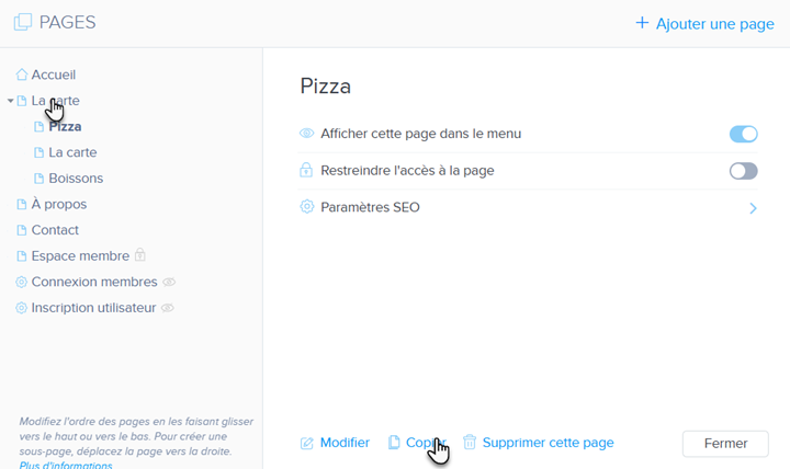 Dans ce guide, vous apprendrez à créer une copie d'une page individuelle de votre site web. Lorsque vous copiez une page, tout le contenu et le design de la page originale seront dupliqués. Vous pouvez copier n'importe quelle page de votre site web, à l'exception des pages système (telles que connexion, inscription, etc.) et de la page d'accueil.