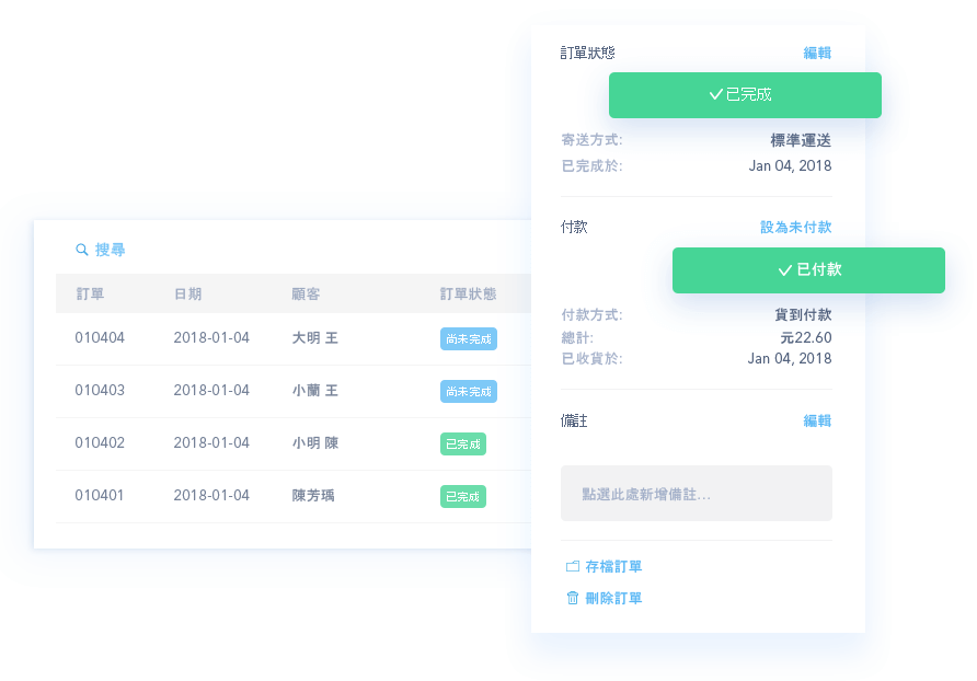 允許您的消費者輕鬆又安全地以信用卡付款。在我們簡單直接的訂單管理,您可以隨時更新訂單情形。您可以查看已付款訂單和需出貨的商品數量。