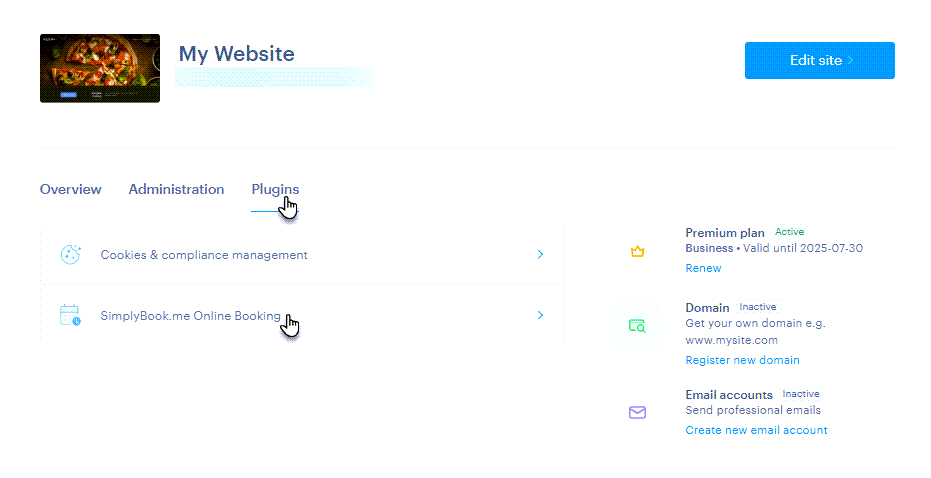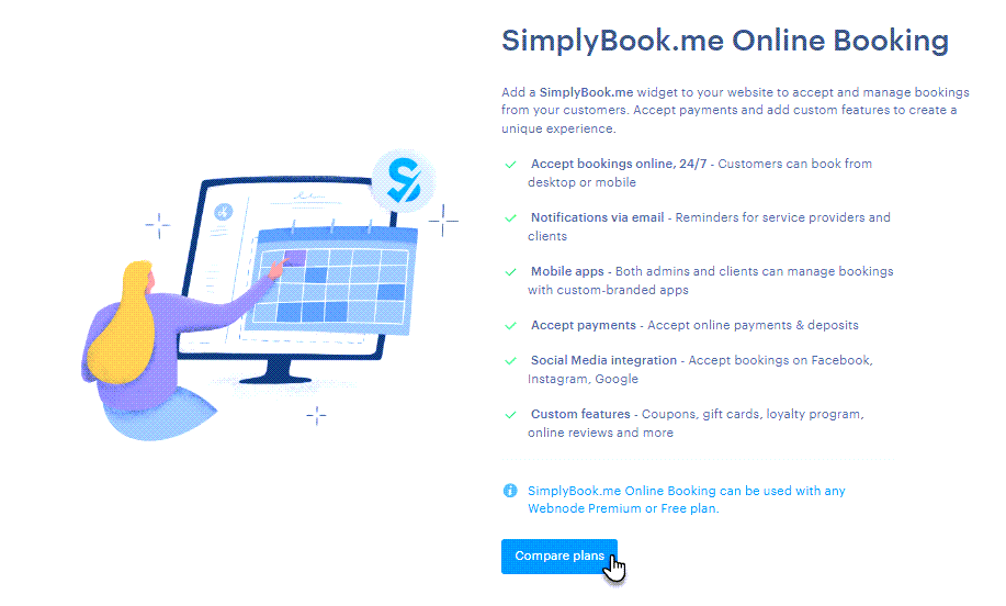 In this guide, you will learn how to purchase the SimplyBook.me add-on service for your Webnode project. This is a booking system that allows you to add an appointment booking form to your website. Among other features, the system includes the ability to send email notifications for new bookings, a mobile app, payment acceptance, and social media integration