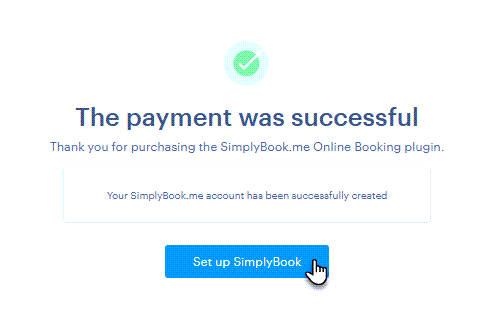 5. After paying for the order, you can start using the plugin. If you paid by card or PayPal, you can immediately proceed to the SimplyBook.me service setup. Creating an account may take a few seconds, but then you will be able to click the Set up SimplyBook.me button.