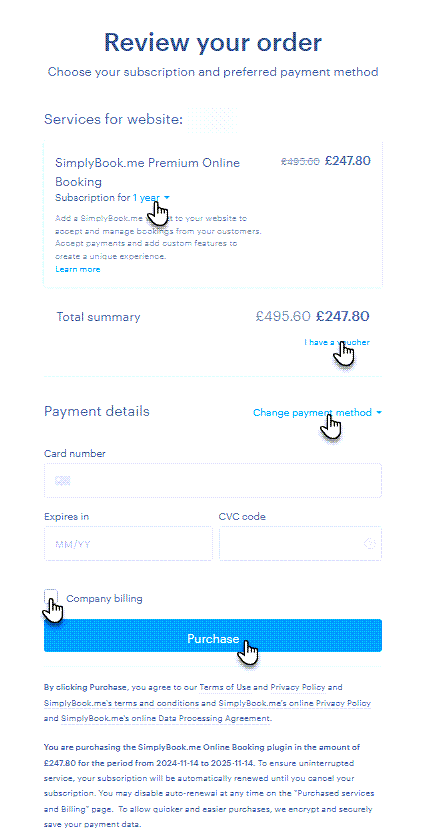 4. Here you can select the duration you want to purchase the service for, use a voucher, choose a payment method, or enter billing information. Confirm your order by clicking the Purchase button.