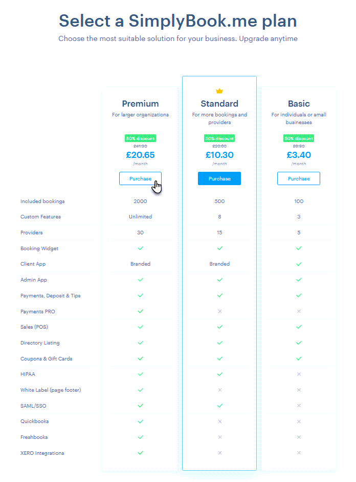 3. Choose a SimplyBook.me service package. You can find a list of individual features on this page.
