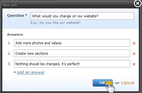 3. Fill in the "Question" and "Answers". You can add as many answers as you like. Click "OK".