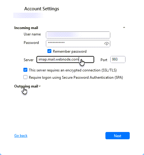 5. In the Server field, change the value to imap.mail.webnode.com, then click Outgoing mail.