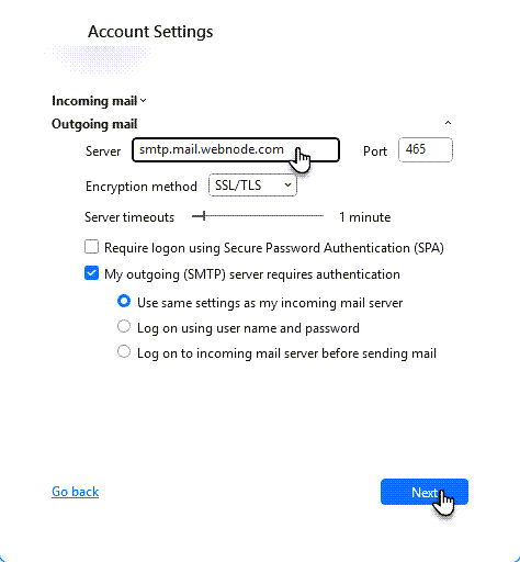 6. In the Server field, change the value to smtp.mail.webnode.com, then click Next.