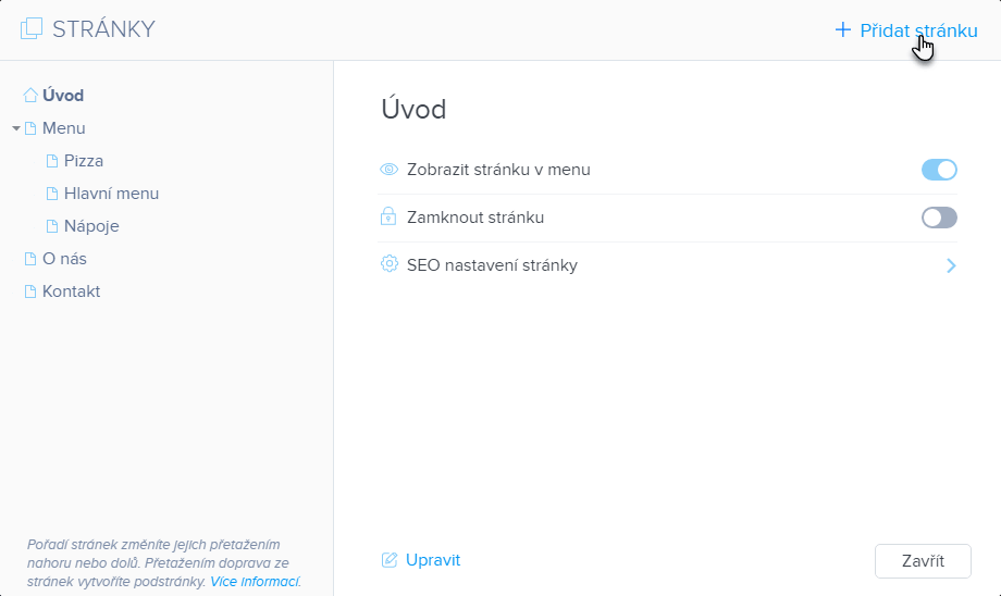 TIP: Již vytvořené stránky lze přejmenovat dle návodu Jak změnit název jednotlivých stránek na webu. Ve správci stránek můžete libovolně měnit pořadí stránek dle návodu Jak změnit pořadí stránek. Rovněž je můžete zanořit pod sebe a vytvořit tak víceúrovňové menu (podstránky), o tomto kroku se dozvíte více v nápovědě Jak vytvořit podstránku.