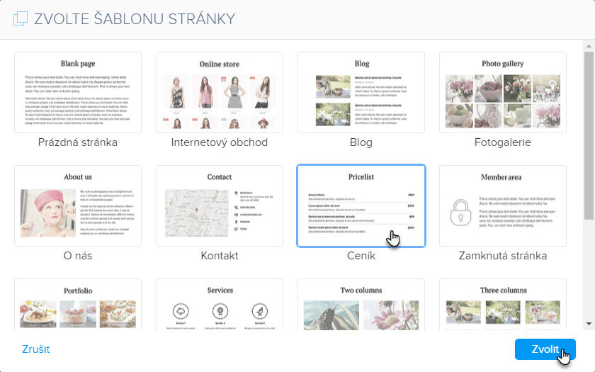 3. Zde si můžete vybrat prázdnou stránku, nebo zvolit jednu ze šablon. Některé šablony slouží pro specifický typ stránky, jako je například blog nebo zamknutá stránka.