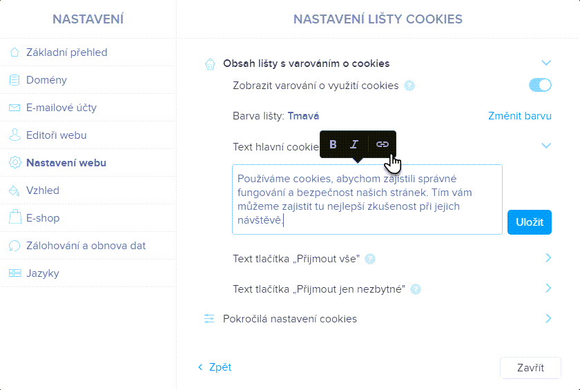 4. Zde dále můžete nastavit vzhled a texty lišty s varováním o cookies.