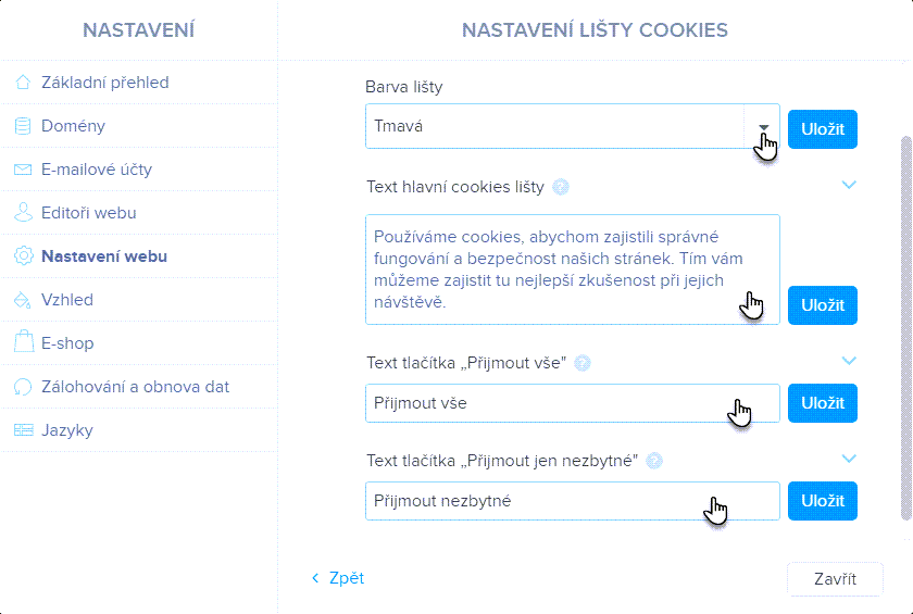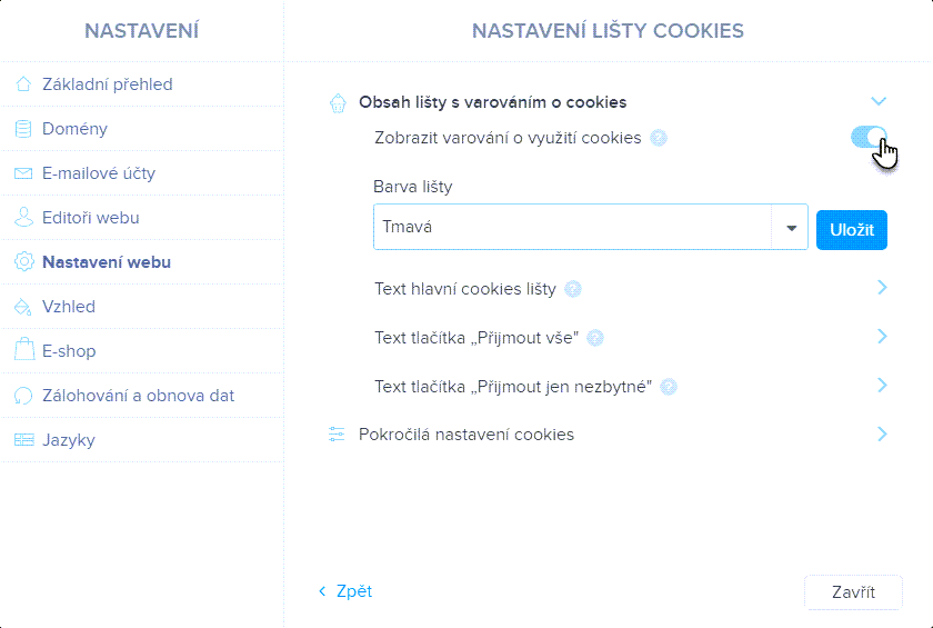 V sekci Barva lišty si nastavíte tmavé, nebo světlé barevné schéma. V kolonkách „Text…“ pak nastavíte znění textu hlavní lišty a tlačítek pro přijmutí cookies. Úpravu textu nezapomeňte Uložit tlačítkem.