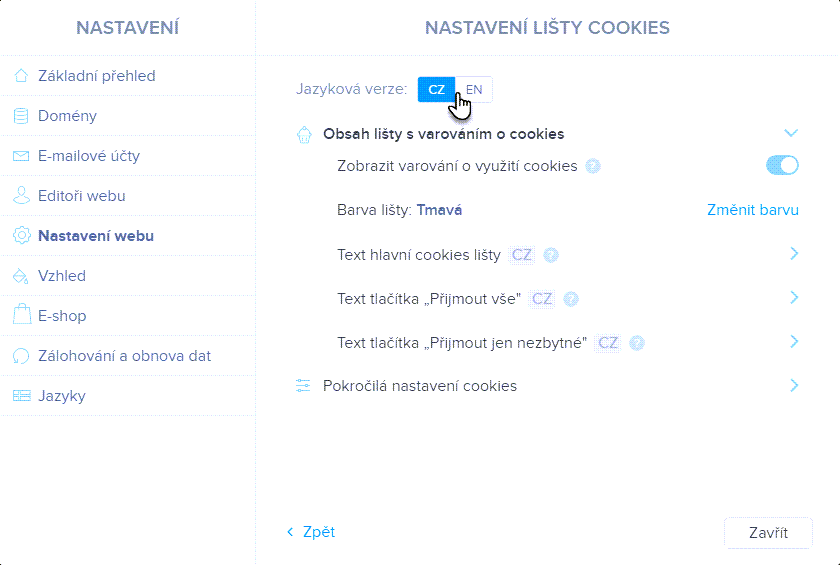 TIP: Pokud máte na projektu více jazyků, můžete je přímo v nastavení lišty pro cookies přepínat a upravit tím text do více jazyků.