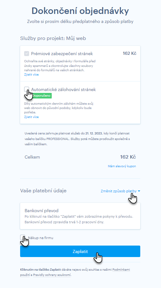 3. V rámci dané objednávky můžete standardně zvolit platební metodu, použít voucher, zadat fakturační údaje nebo případně zakoupit doplňkovou službu Automatické zálohování.