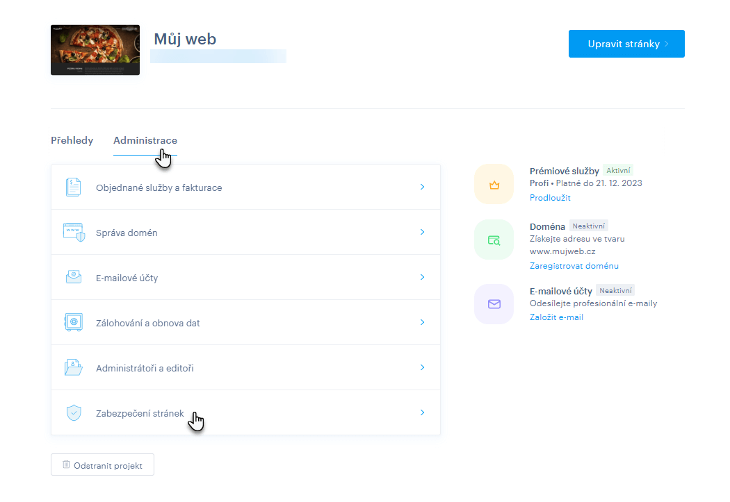 1. V administraci projektu klikněte na Administrace a následně na Zabezpečení stránek.