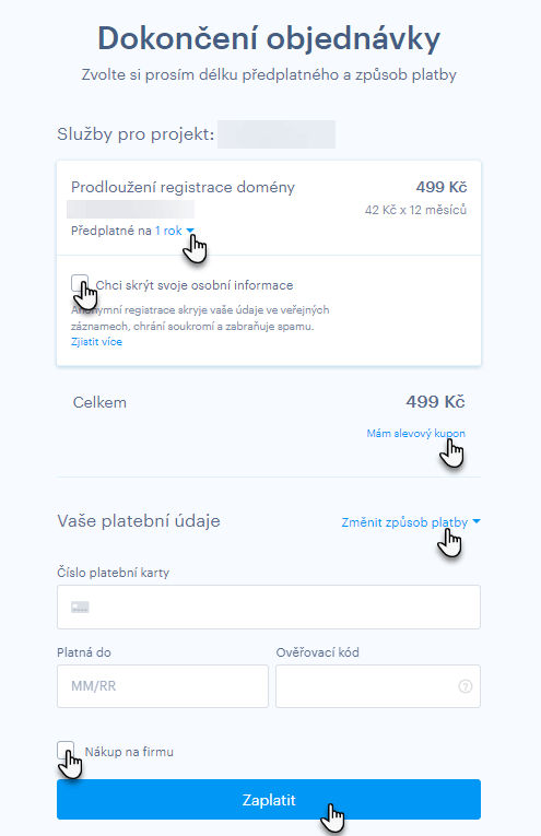 5. V objednávce můžete zvolit délku předplatného, zakoupit skrytou registraci, použít slevový kupon, změnit způsob platby nebo vyplnit fakturační údaje.