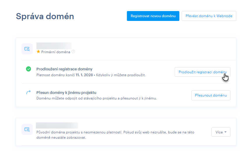 POZOR: Pokud máte doménu k nám pouze nasměrovanou, je třeba řešit prodloužení domény přímo se správcem domény.