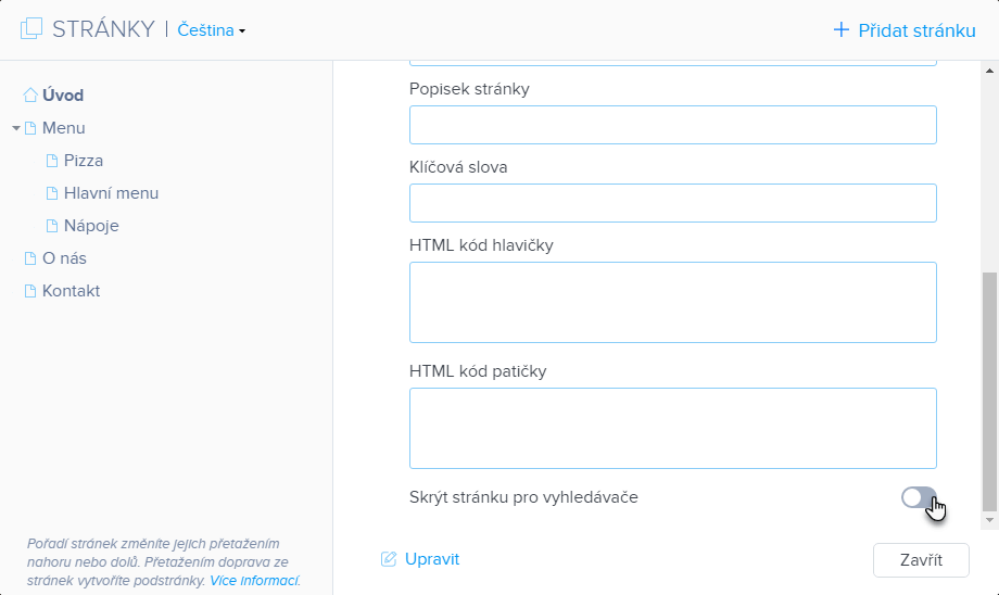 Ve Webnode je možné pro vyhledávače skrýt jednotlivé stránky nebo i celý web najednou. Tato funkce je užitečná v případě, že si přejete, aby vaše stránky nebyly dohledatelné ve vyhledávačích, jako např. Google.