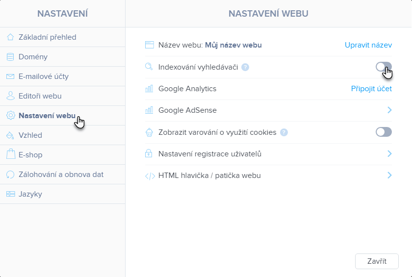 2. V záložce Nastavení webu klikněte na tlačítko Indexování vyhledávači.