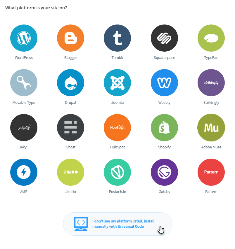 6. Zvolte možnost I don't see my platform listed, install manually with Universal Code.
