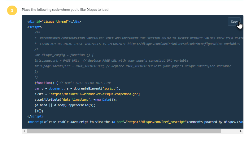 7. Sjeďte níže na stránku a zkopírujte kód.