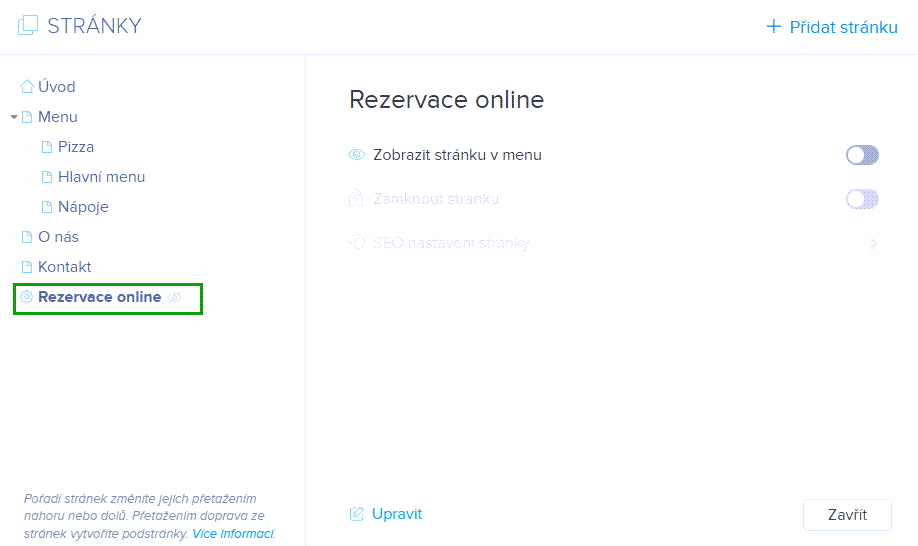 POZOR: Pokud máte na stránkách přidán alespoň jeden widget, můžete v nabídce Stránky nalézt stránku Online rezervace. Jedná se o systémovou stránku, která je ve výchozím stavu skrytá a nelze ji odstranit, nemusíte ji však žádným způsoben ani upravovat nebo na ní cokoliv řešit. Stránka slouží k přesměrování z potvrzovacího e-mailu uživatele, pokud uživatel klikne na zrušení nebo přehled rezervace. Pokud odeberete z webu všechny widgety služby SimplyBook.me, tato stránka se sama od sebe odebere.