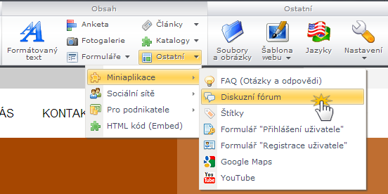 1. Přihlaste se do editoru webu. Přejděte na stránku, na kterou chcete diskuzní fórum umístit. Klikněte na tlačítko "Ostatní" - "Miniaplikace" a pak na "Diskuzní fórum".