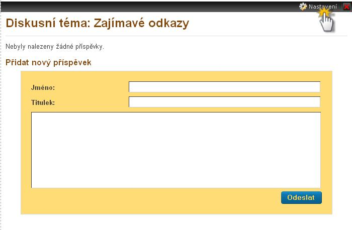 TIP: Budete-li chtít změnit nastavení diskuzního fóra, klikněte na tlačítko "Nastavení" v černé liště bloku diskuzního fóra. Můžete změnit "Název diskuze", možnosti zobrazování příspěvků (vnoření, řazení, stránkování, zobrazení, atd.). Pokud je u položky "Formulář na přidání nového příspěvku" zaškrtnuto ANO, zobrazí se formulář pro přidání nového příspěvku. Pokud zaškrtnete NE, zobrazí se pouze tlačítko "Přidat příspěvek".