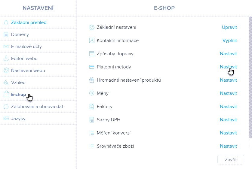 3. A dále vyberte záložku E-shop, kde klikněte na tlačítko Nastavit u položky Platební metody.