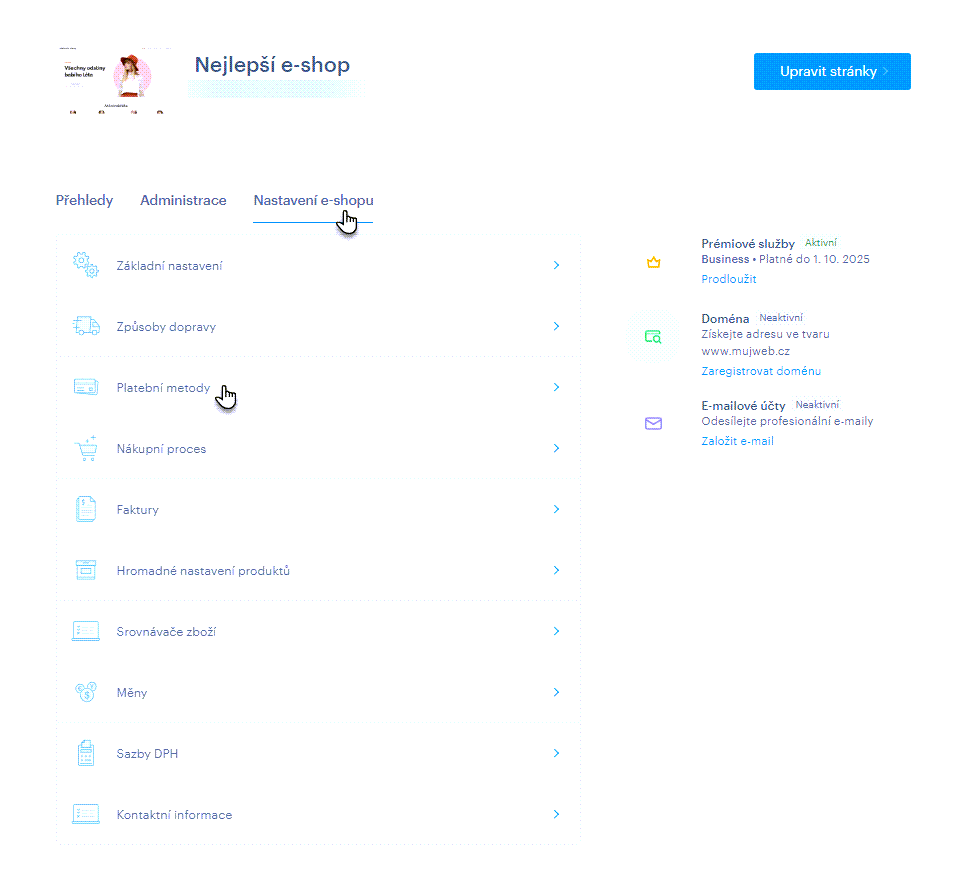 4. V e-shopu jsou připraveny příklady některých platebních metod, ty si můžete přizpůsobit tak, že u vybrané platební metody kliknete na Upravit.