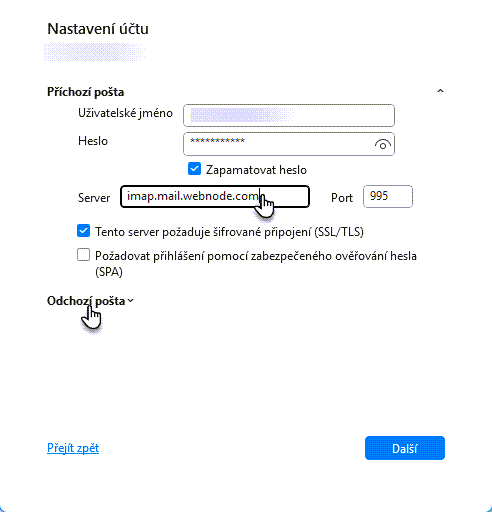 5. Zde v políčku Server upravte hodnotu na imap.mail.webnode.com a dále klikněte na možnost Odchozí pošta.