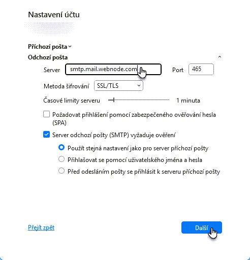 6. Zde v políčku Server upravte hodnotu na smtp.mail.webnode.com a dále klikněte na možnost Další.