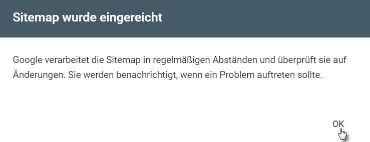 2. Eine Nachricht, dass Ihre Sitemap erfolgreich hinzugefügt wurde, wird kurz danach erscheinen. Gehen Sie auf Ok, um das Fenster zu schließen.