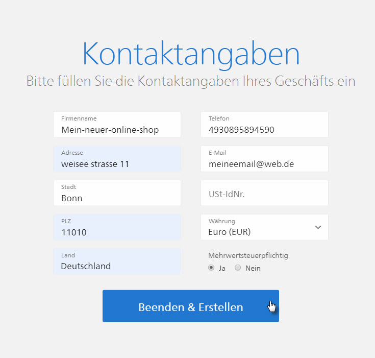 • Geben Sie Ihre Kontaktangaben an und beenden Sie die Registrierung indem Sie auf Beenden & Erstellen klicken.