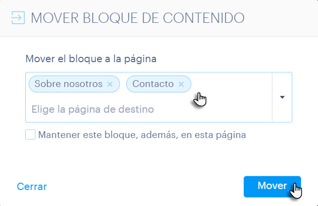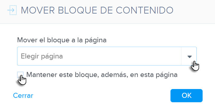 2. Elige la página a la que vas a mover el contenido. Si marcas la opción “Mantener este bloque, además, en esta página”, la sección se copiará.