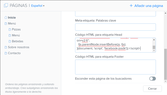 SUGERENCIA: Si deseas que tu widget de Facebook aparezca en todas las páginas de tu sitio web, asegúrate de ingresar los dos códigos manualmente en cada página.