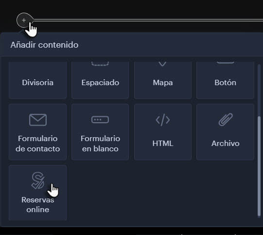 1. En el editor, añade un nuevo contenido y selecciona la opción Reservas online.