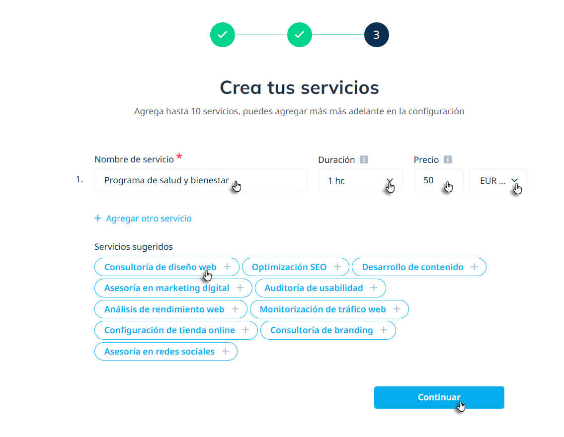 6. Ahora, selecciona los servicios que ofreces, eligiéndolos de las sugerencias disponibles o agregando los tuyos. Luego, define la duración, el precio y la moneda.