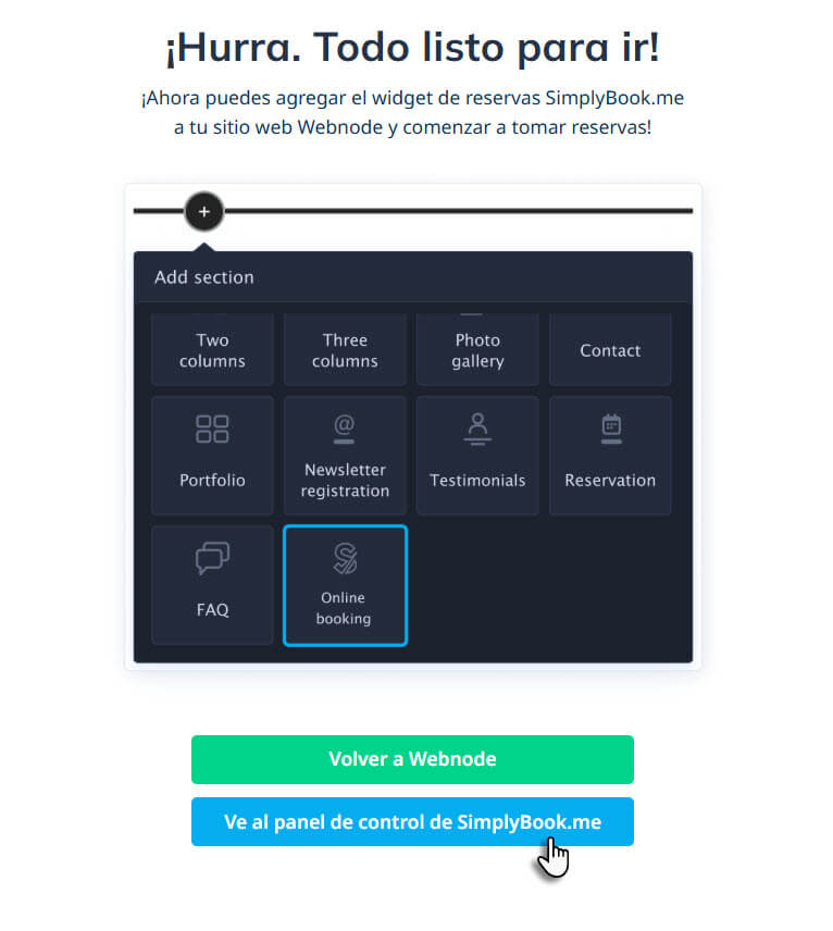 7. La configuración básica ahora está completa, y el widget en tu sitio está activo, mostrando los servicios que configuraste. Si aún no has agregado el formulario de reservas a una página, conuslta nuestra guía Cómo agregar un formulario de reserva en línea de SimplyBook.me a tu sitio web. La opción Volver a Webnode te llevará a la administración del proyecto en Webnode. Con la opción Ve al panel de control de SimplyBook.me, puedes acceder a la administración de SimplyBook.me.
