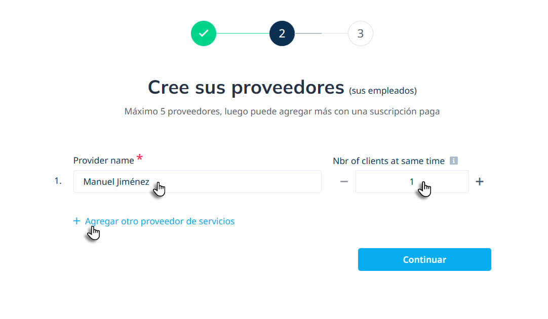 5. Ahora puedes agregar proveedores (tus empleados) que realizan los servicios, así como definir cuántos clientes pueden reservar el servicio al mismo tiempo.