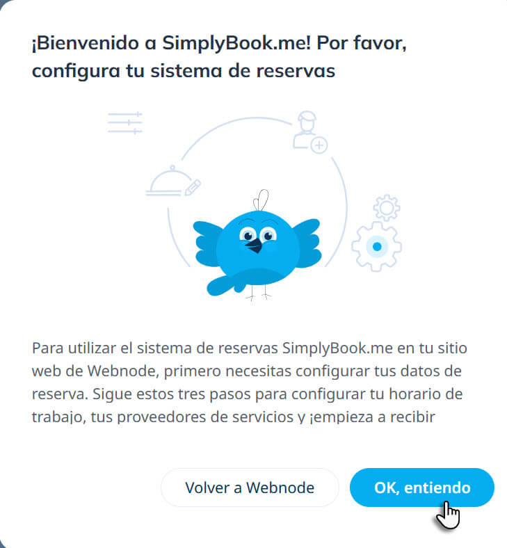 2. Al ingresar por primera vez a la administración de reservas, deberás completar una configuración básica. Para continuar, simplemente haz clic en Ok, lo entiendo. Si prefieres configurarlo más tarde, puedes volver a la administración de Webnode haciendo clic en el botón Volver a Webnode.