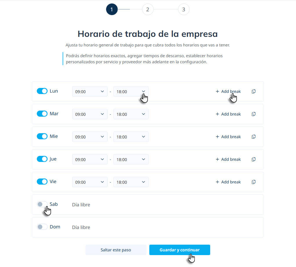 4. En la siguiente ventana, completa el horario de trabajo de tu empresa, o bien, especifica las horas exactas en las que ofreces servicios que los visitantes pueden reservar. También tienes la opción de desactivar los días no laborables o programar una pausa durante el día.