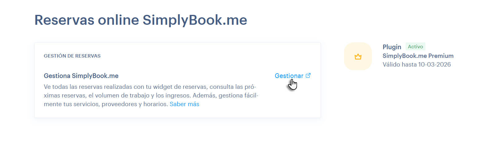 SimplyBook.me (sistema de reservas). Si aún no has adquirido el servicio, puedes seguir nuestra guía Cómo adquirir el sistema de reservas SimplyBook.me.