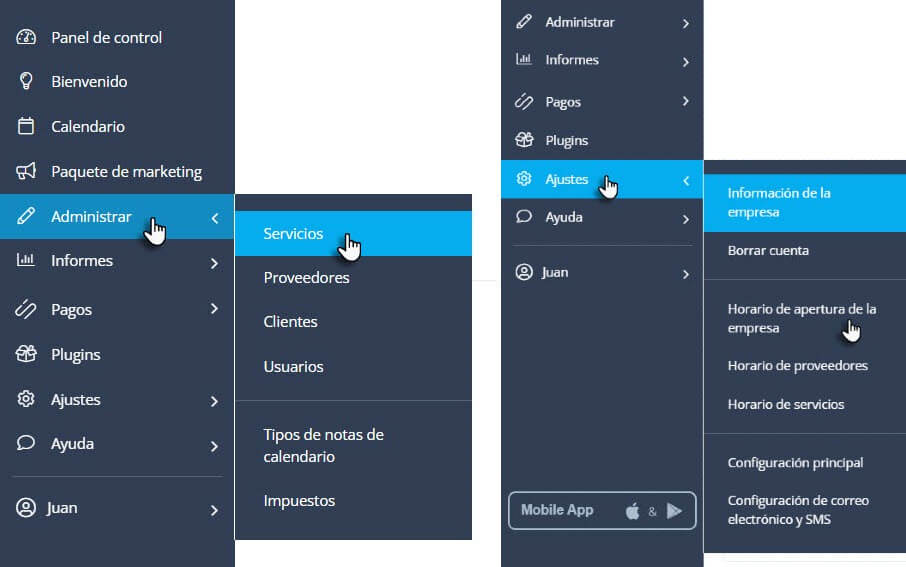 10. En las secciones Administrar y Ajustes a la izquierda, puedes modificar la información que ingresaste durante la configuración inicial, como el horario de apertura, el personal, los servicios y más. Todos los cambios se actualizarán automáticamente en el widget de tu sitio web.